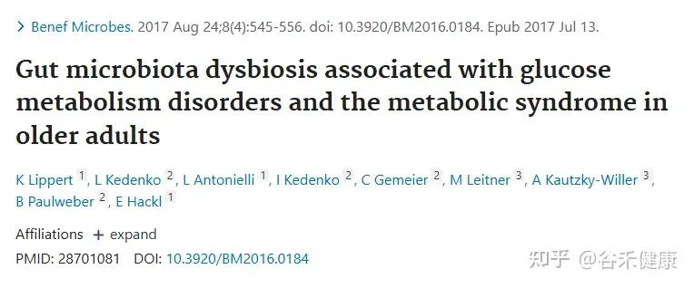 Lippert K, Kedenko L, Antonielli L, Kedenko I, Gemeier C, Leitner M, Kautzky-Willer A, Paulweber B, Hackl E. Gut microbiota dysbiosis associated with glucose metabolism disorders and the metabolic syndrome in older adults. Benef Microbes. 2017 Aug 24;8(4):545-556.
