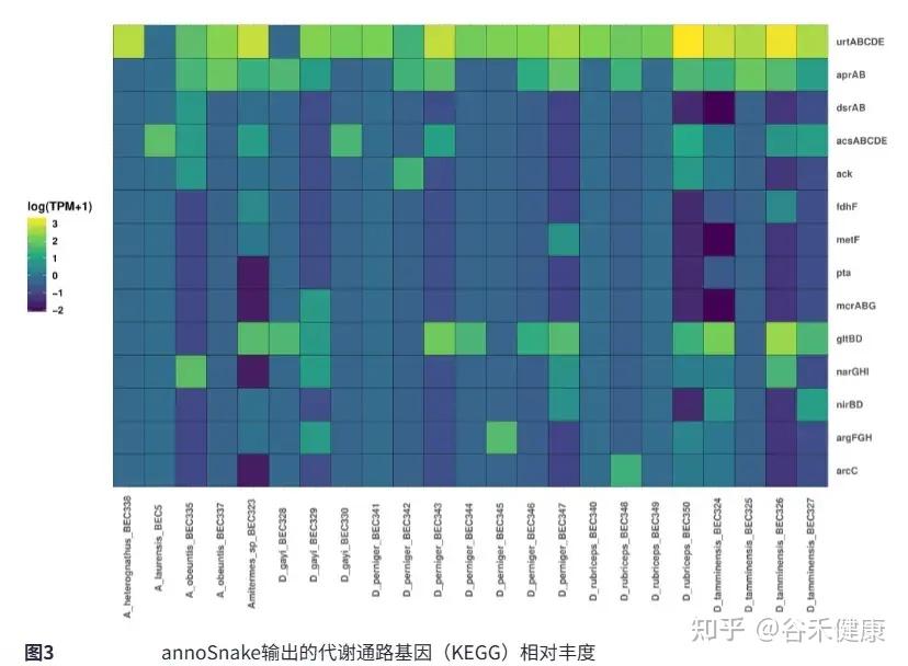 在所有样本中,annoSnake识别出硫酸盐还原通路的关键基因,如aprA、aprB和dsrAB,这符合白蚁肠道微生物组中硫酸盐还原过程的常见模式。还有许多与木质纤维素消化相关的KEGG代谢通路基因,这支持白蚁肠道微生物组在碳循环和能量代谢方面的普遍功能特征。