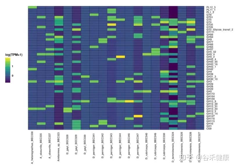 annoSnake检测到大量CAZymes(碳水化合物活性酶)。D. tamminensis在不同群体间的GHs丰度差异再次暗示饮食灵活性,且部分群体GHs模式与腐殖/土壤取食物种一致;螺旋体主导的D_gayi_BEC329中GHs丰富,符合凋落物取食物种的特性,而在梭菌主导的D. gayi群体中GHs较低。