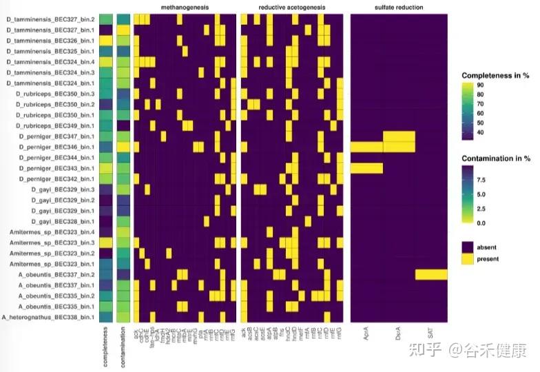 图中展示了MAGs中木质纤维素消化相关代谢途径(甲烷生成、还原性乙酸生成、硫酸盐还原)基因的存在/缺失。左侧给出MAG的完整性和污染分值,颜色越浅表示完整性越高,污染越少。 紫色方块表示基因缺失,黄色方块表示基因存在。