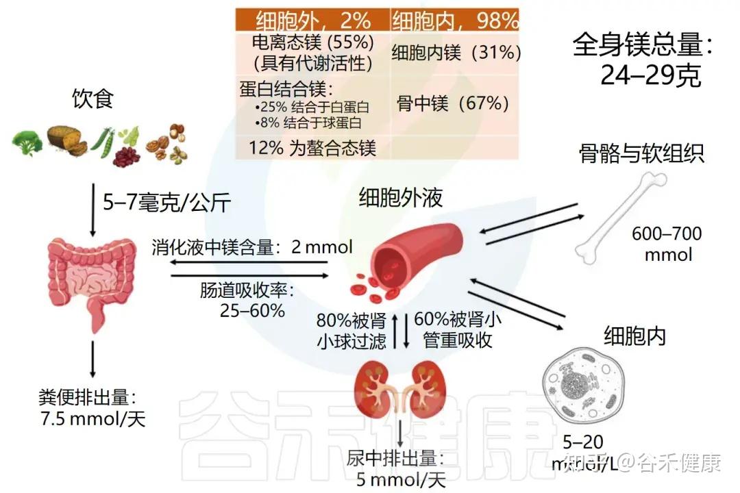 血中的镁浓度受到肠道吸收、骨骼储备和肾脏排泄三方面的精密平衡控制。