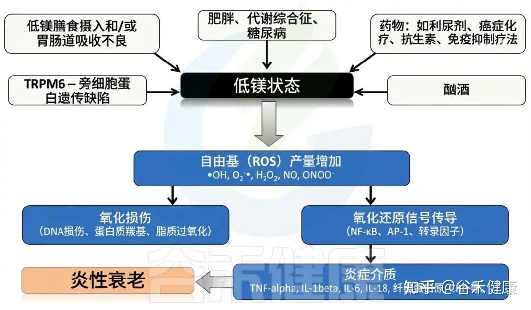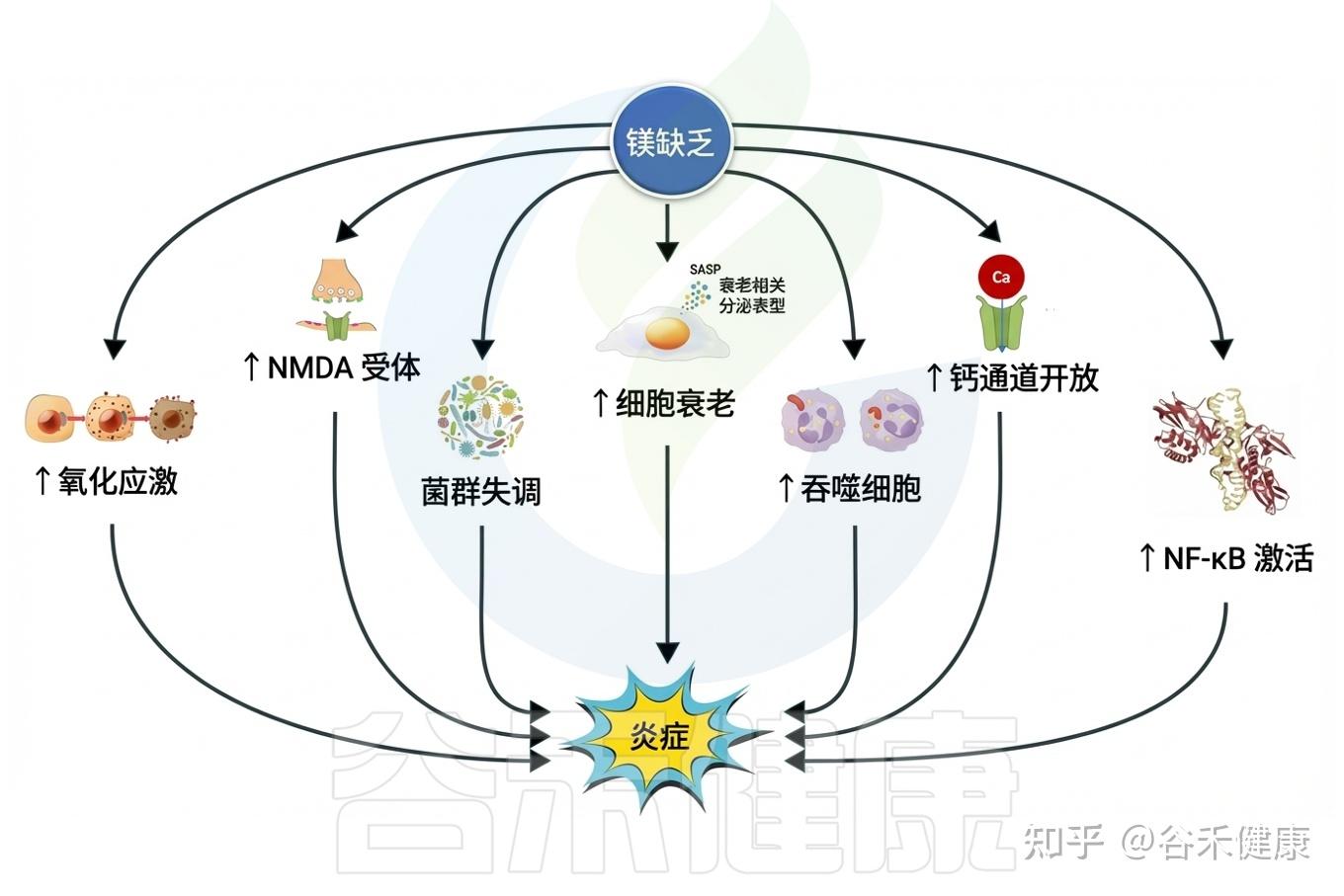 镁不足可促发慢性低度炎症,增加IL-6、TNF-α等炎性标志物。