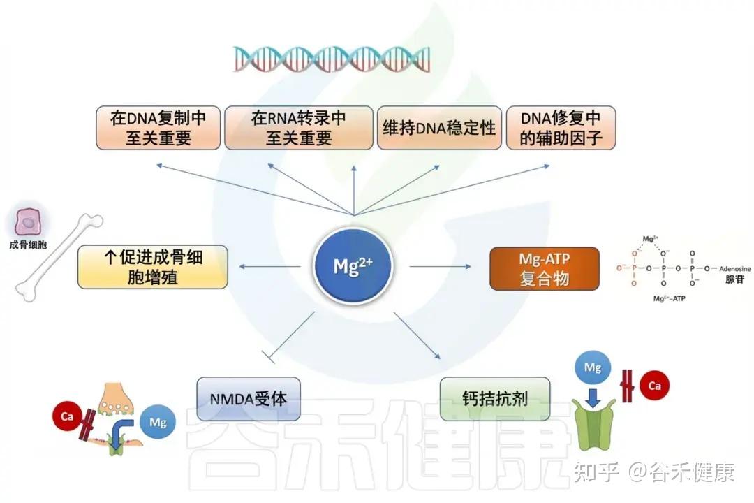 镁参与骨骼(约储存体内60%镁)、线粒体、核酸及膜结构的稳定,对DNA修复、染色体完整性和细胞衰老的延迟具有重要作用。
