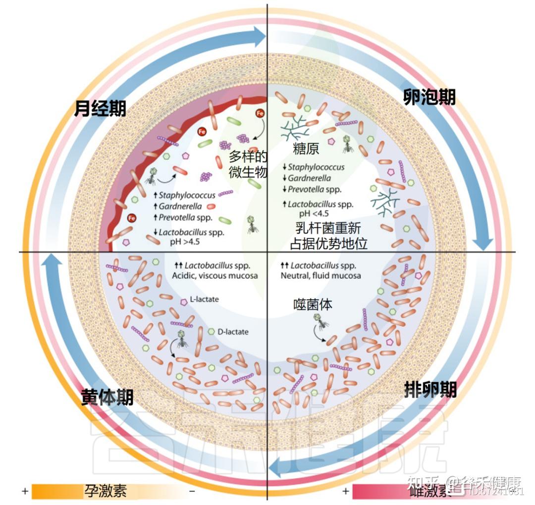 月经期普雷沃氏菌和加德纳菌的增多可延续至增殖期初,此时雌激素水平仍较低;而在卵泡晚期至排卵前,雌激素达到峰值,与乳杆菌重新占优势相吻合。