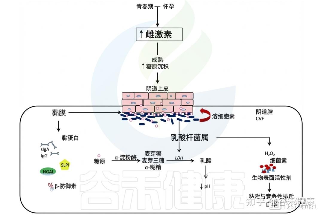 雌激素的作用超越月经周期,在青春期其分泌上升,促使阴道上皮成熟增厚,形成由富含糖原的多层细胞构成的屏障。顶层细胞周期性脱落,释放糖原至阴道腔内。卵泡晚期乳杆菌优势的恢复与糖原可用性增加密切相关,并在整个黄体期保持稳定。