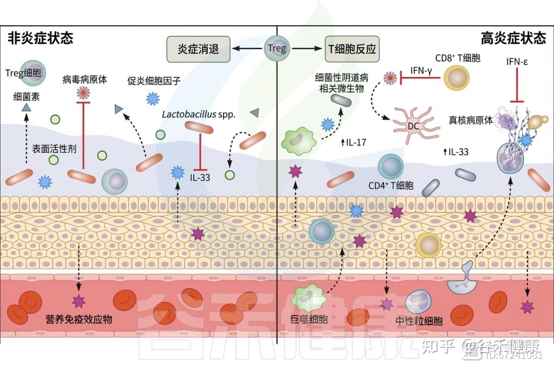 其他免疫细胞,包括中性粒细胞和抗原呈递细胞(APC),共同参与阴道免疫的调节。研究表明,低丰度乳杆菌且高多样性的微生物群体与促炎细胞因子水平升高相关,提示其在炎症反应中可能发挥关键角色。