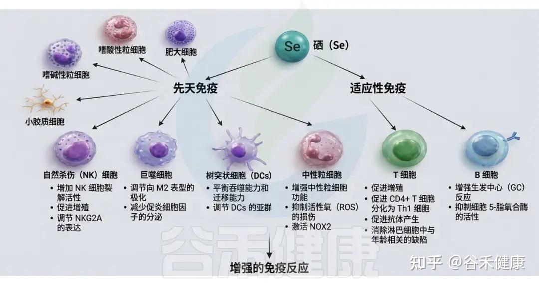 硒可以调控NK细胞、巨噬细胞、树突状细胞、粒细胞、肥大细胞和小胶质细胞的先天免疫活性。它还影响T细胞的增殖和分化,并通过调节Tfh细胞和5-脂氧化酶活性来影响B细胞的分化和存活能力。