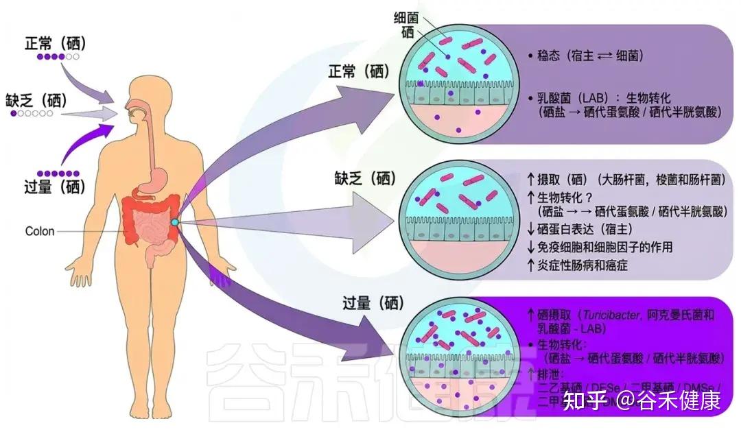 肠道菌群能够代谢多种无机和有机硒,过量细菌摄取硒可能导致宿主硒蛋白缺乏,部分细菌还会通过硒来改变致病性。并且硒与肠道微生物群的作用在炎症性肠病(IBD)、癌症、甲状腺功能障碍、糖尿病、心血管疾病和神经发生性疾病等疾病中存在重要影响。