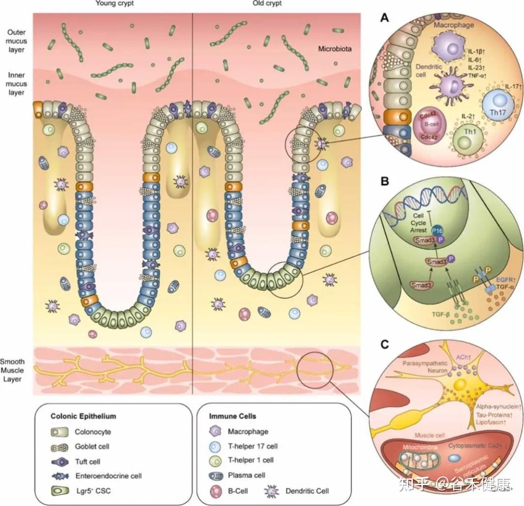 研究表明,衰老导致结肠黏膜上皮更新速度减缓,隐窝干细胞活性降低,紧密连接蛋白(如occludin、claudin、ZO-1)的表达异常。这些变化使得细胞通透性增加,黏液层变薄,黏液屏障的完整性下降。同时,免疫系统也出现了免疫衰老现象,降低了对有害菌的防御能力。