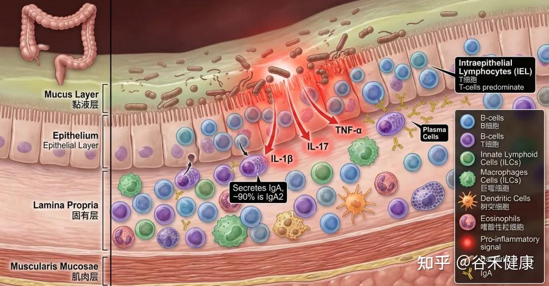 在上皮层内部还有一类“上皮内淋巴细胞”(IEL),以T细胞为主。结肠里“浆细胞”也很多,它们主要分泌IgA抗体(对肠道微生物的选择性定植非常关键),用来在肠道表面“温和地管住细菌”。其中大约90%是IgA2这一类型。