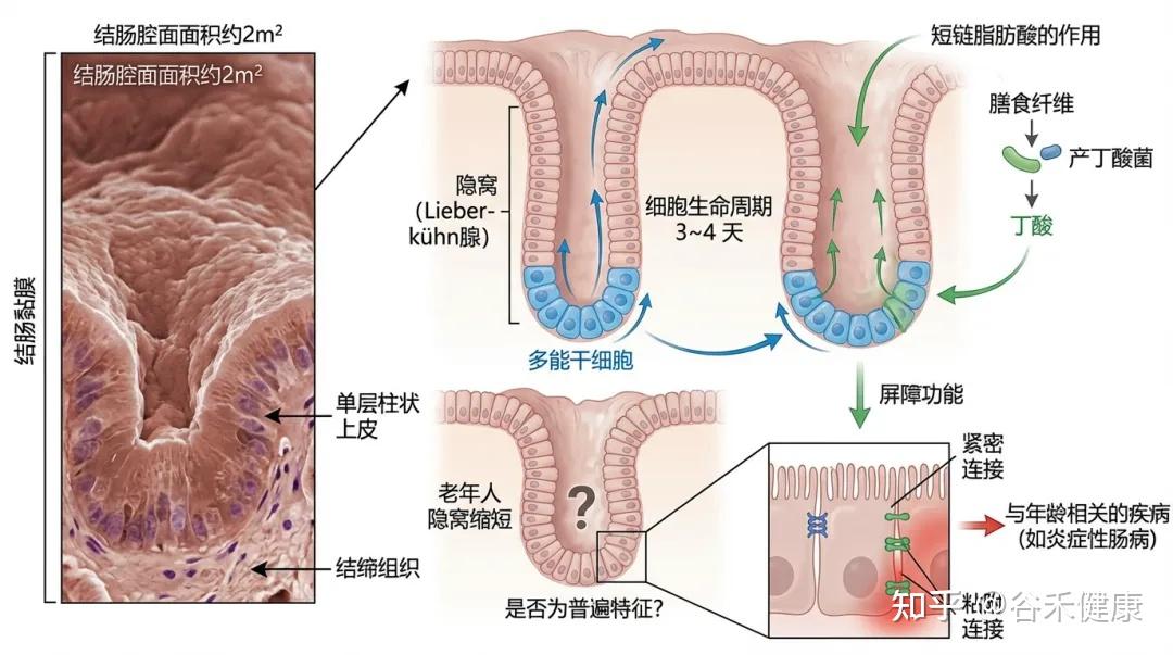 研究发现,老年人的隐窝可能会缩短,但是否这是结肠老化的普遍特征仍需进一步验证。