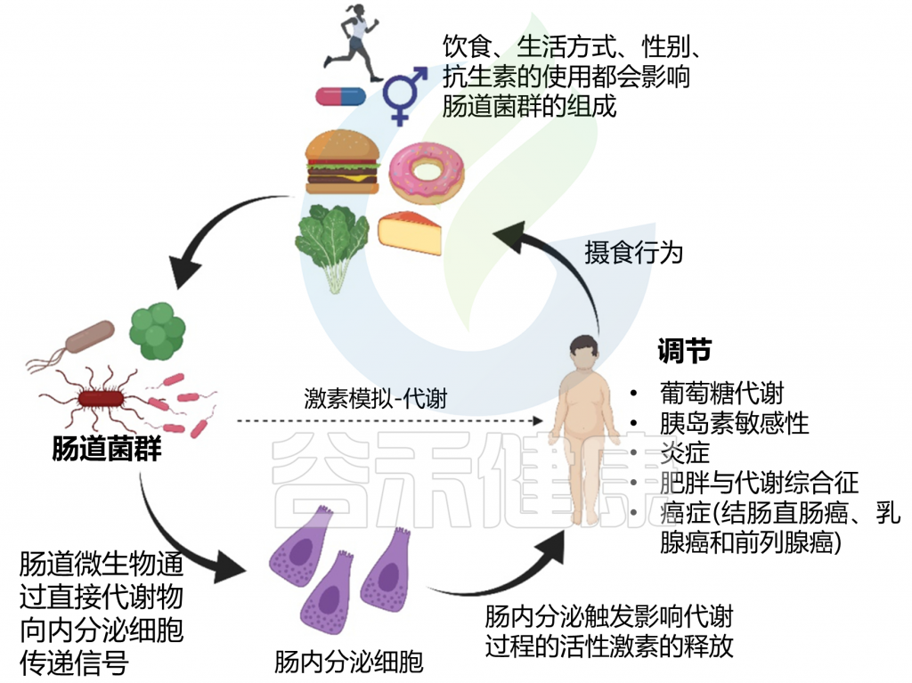 下图描述由宿主中激素释放活性障碍引起的生理效应,包括代谢过程的变化和肠道内炎症和癌症的调节。