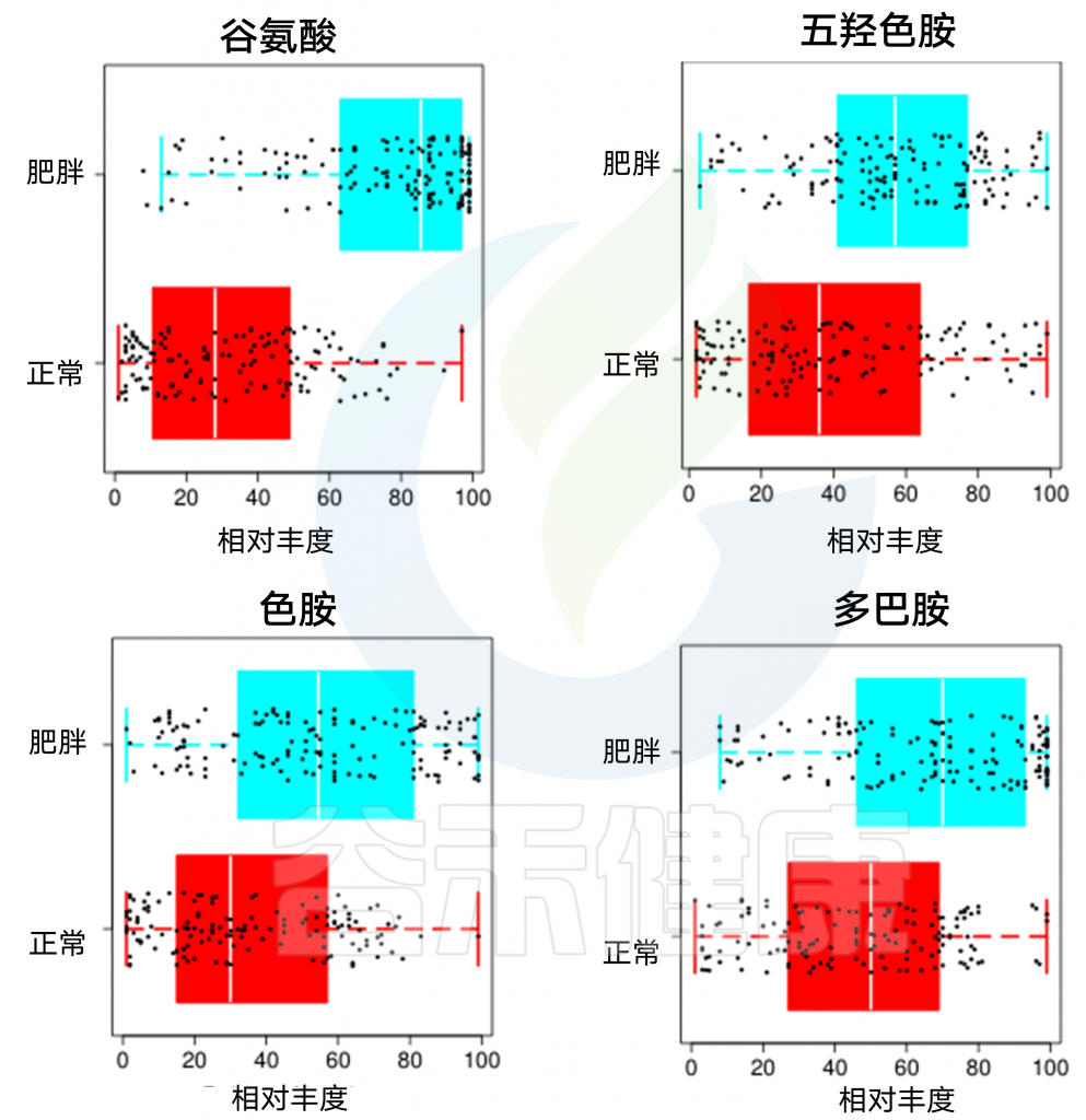 神经递质的检测数据显示与神经兴奋有关的多种神经递质和代谢物质肥胖人群普遍偏高,包括: