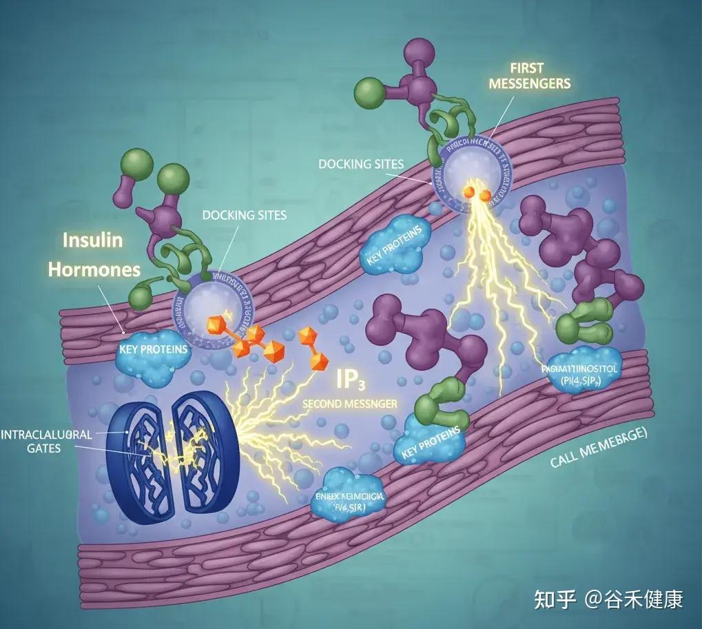 当胰岛素或激素(第一信使)敲响细胞的大门时,它自己不进去,而是派 IP₃(第二信使)在细胞内部跑腿传达命令。IP₃ 的一个重要任务就是去打开钙离子的阀门,而钙离子就像是启动细胞各种功能的电火花。