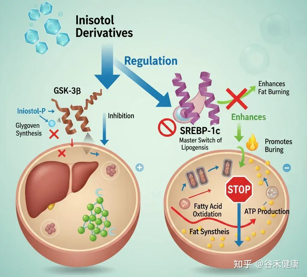肌醇衍生物能精准调控肝脏和脂肪细胞内的关键酶,如糖原合酶激酶-3β(GSK-3β)和固醇调节元件结合蛋白-1c(SREBP-1c)。